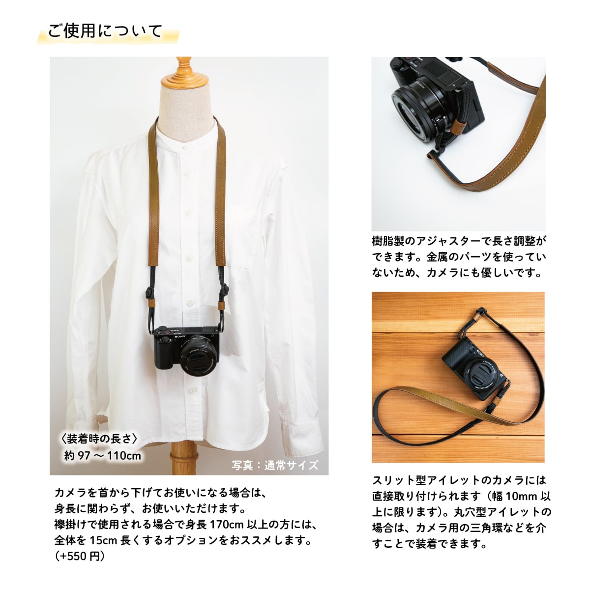 カメラを首から下げてお使いになる場合は、身長に関わらずお使いいただけます。